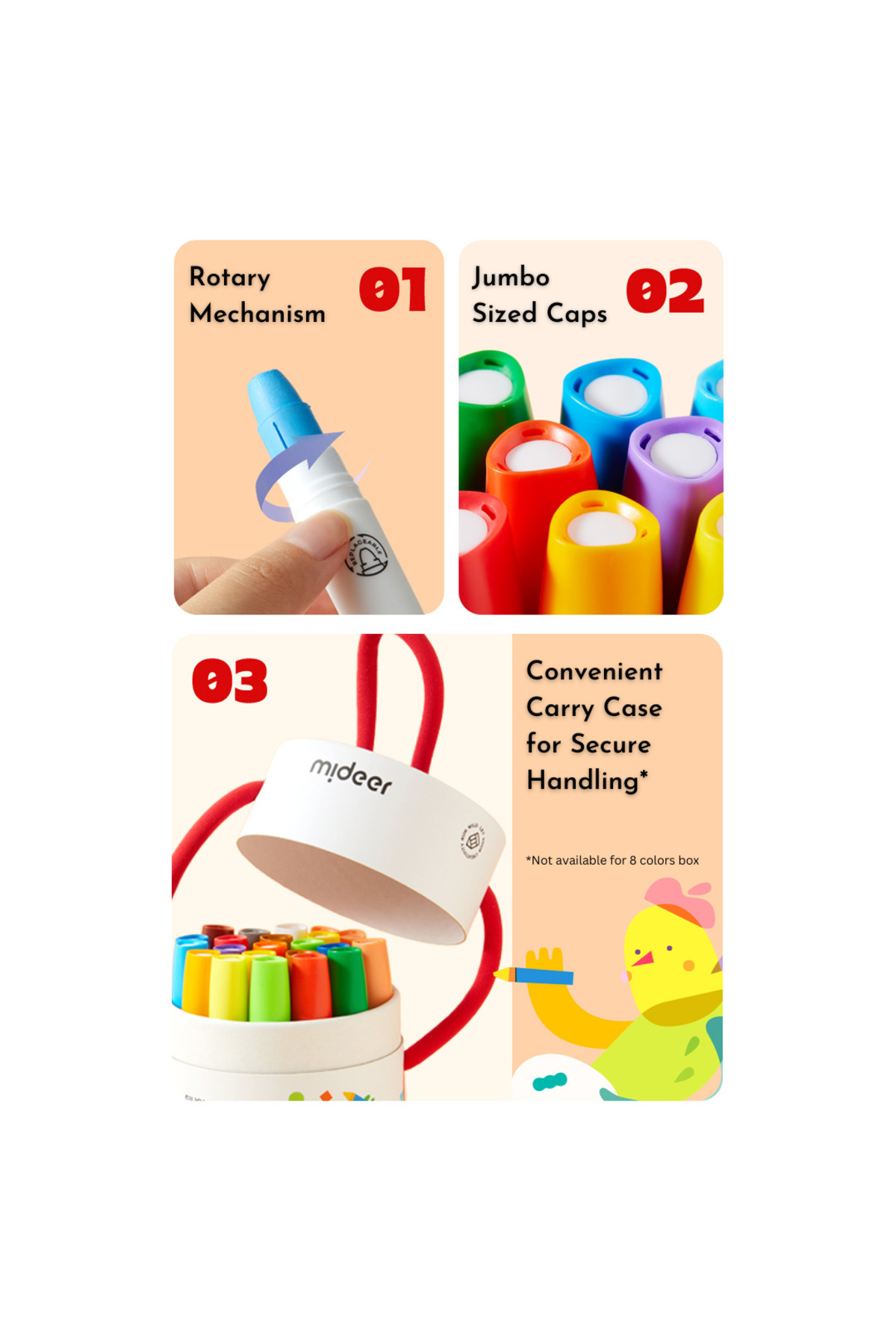 معرفی مداد شمعی چرخان قابل شستشوی میدیر، ابزار هنری بینقص برای سازندگان خردسال. این مداد شمعیها با در نظر گرفتن