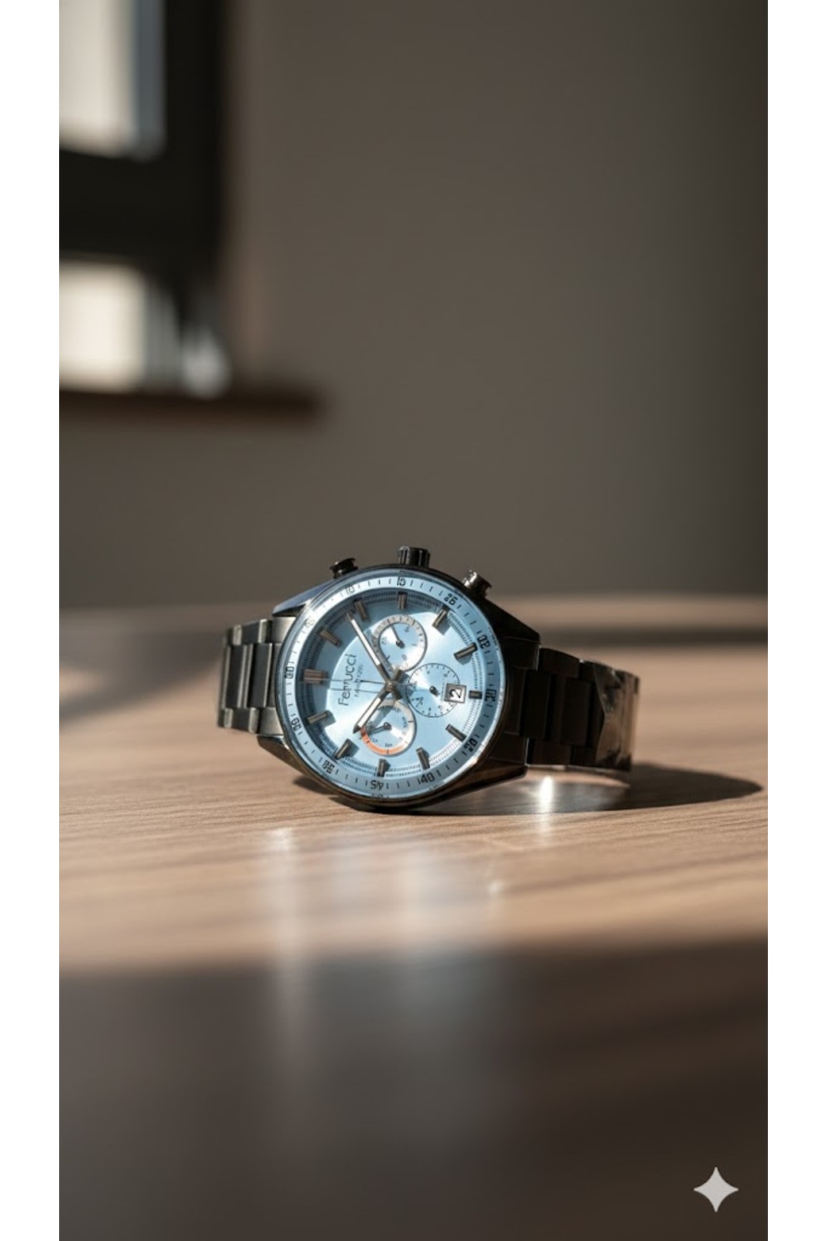 ساعت مچی مردانه مشکی، صفحه آبی یخی – بند فلزی شیک، ۲ سال گارانتی