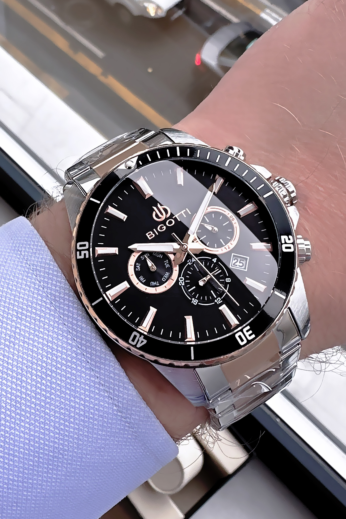 ساعت مچی مردانه ضدآب ۵ اتم با بند فولادی رزگلد ویژه در جعبه + Bme2027C2