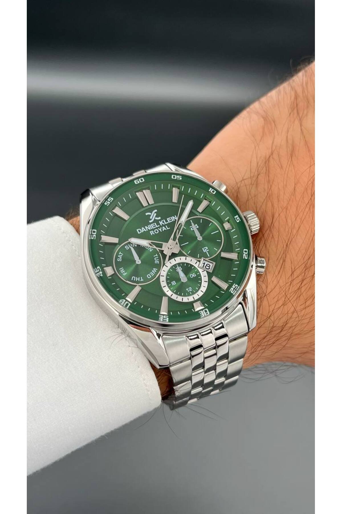 ساعت مچی مردانه نقرهای-سبز با بند فولادی و مقاومت در برابر آب تا ۳ اتمسفر