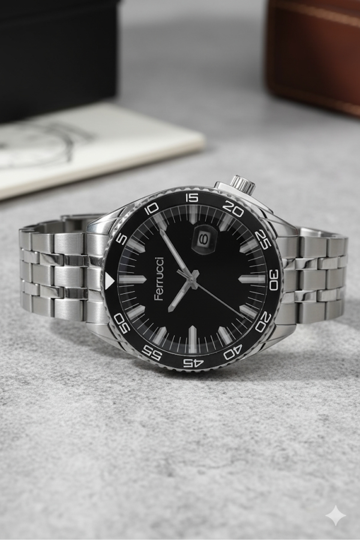 ساعت مچی مردانه نقرهای رنگ، صفحه مشکی با تقویم – بند فلزی شیک، ضمانت ۲ ساله