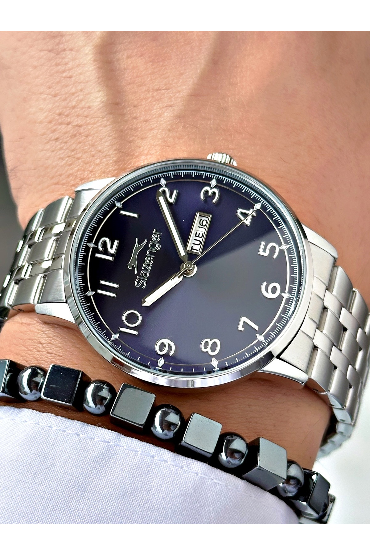 ساعت مچی مردانه مدل 2560.07Mr با قاب فولادی، صفحه نقرهای-آبی تیره، ضدآب تا ۱۰ اتمسفر و عقربههای عددی
