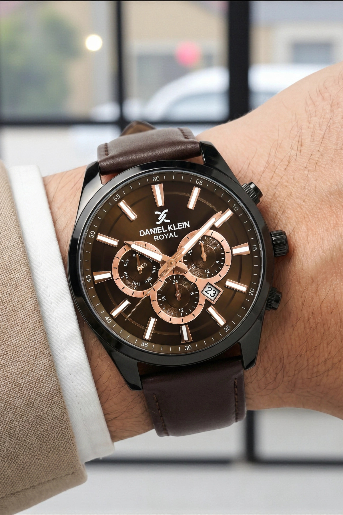 ساعت مچی مردانه با بند چرمی قهوهای و قاب فلزی مشکی، دارای تقویم و دستبند، هدیه