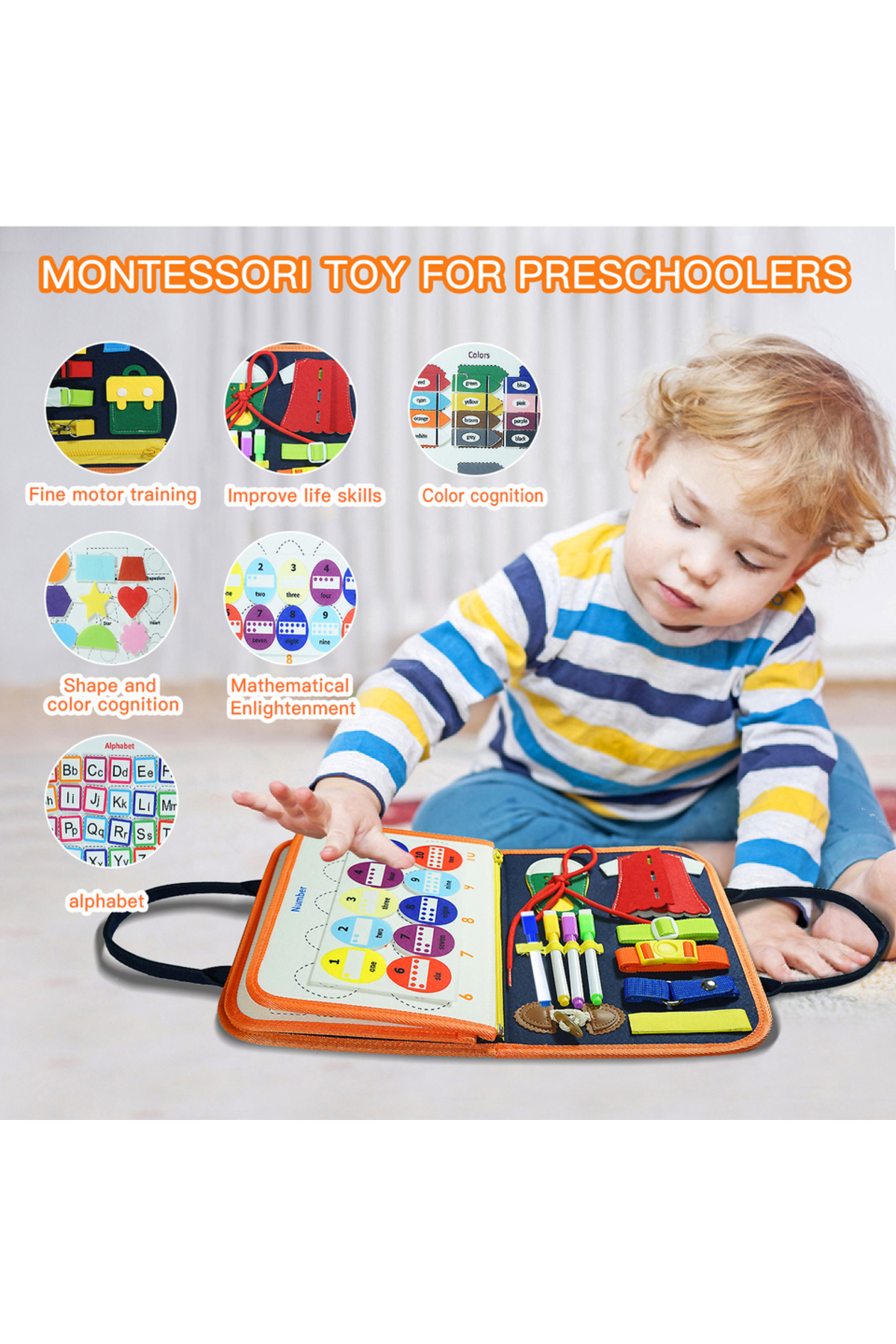 تخته سرگرمی اورنج مونتهسوری برای کودکان ۳ تا ۶ ساله – اسباببازی آموزشی حسی برای یادگیری اولیه و مهارتهای حرکتی ظریف