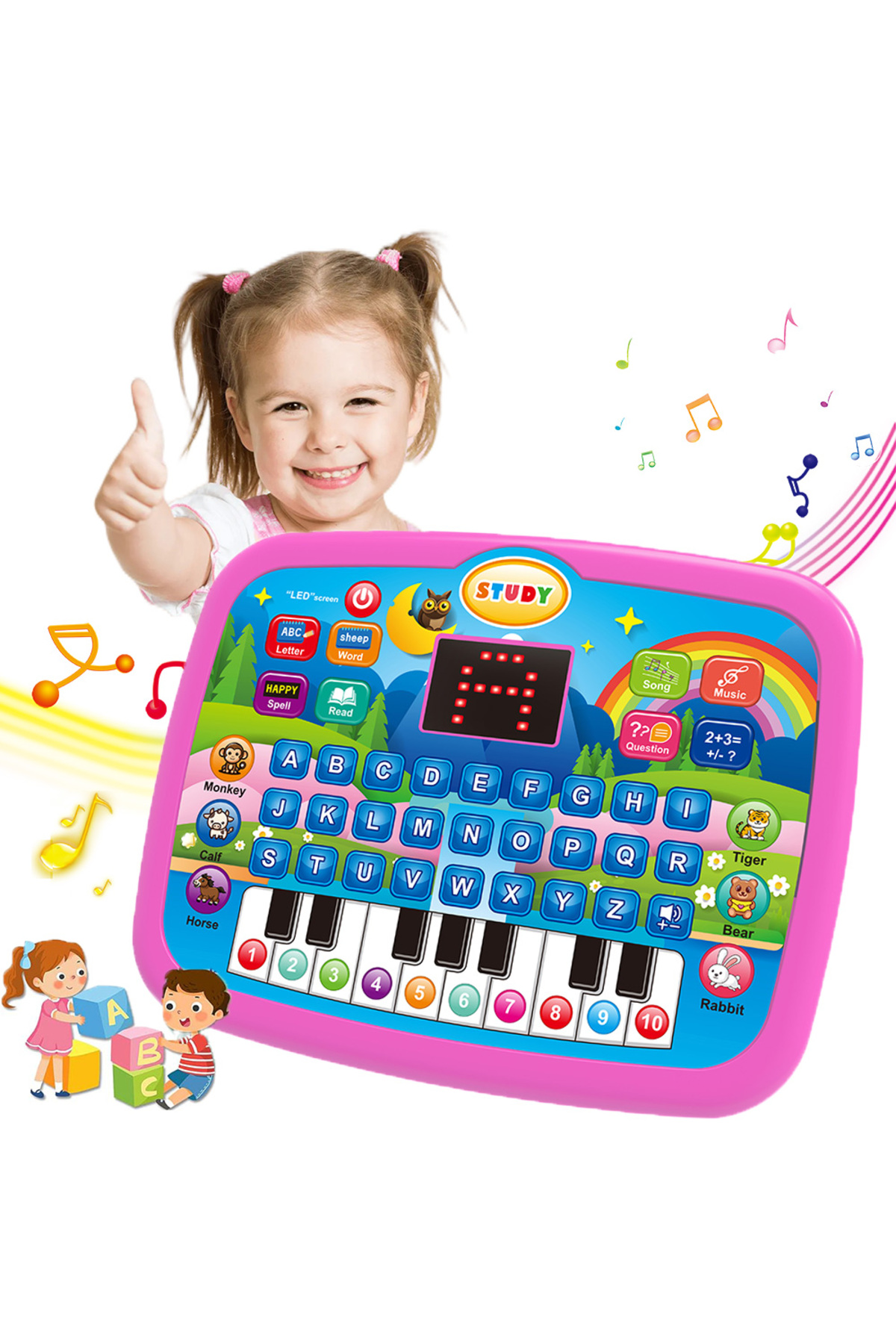 تبلت اسباببازی آموزشی صورتی کودکان، مناسب سنین ۳ سال به بالا، یادگیری سواد، ریاضی و موسیقی، قابلیت استفاده بهعنوان کیبورد الکترونیکی