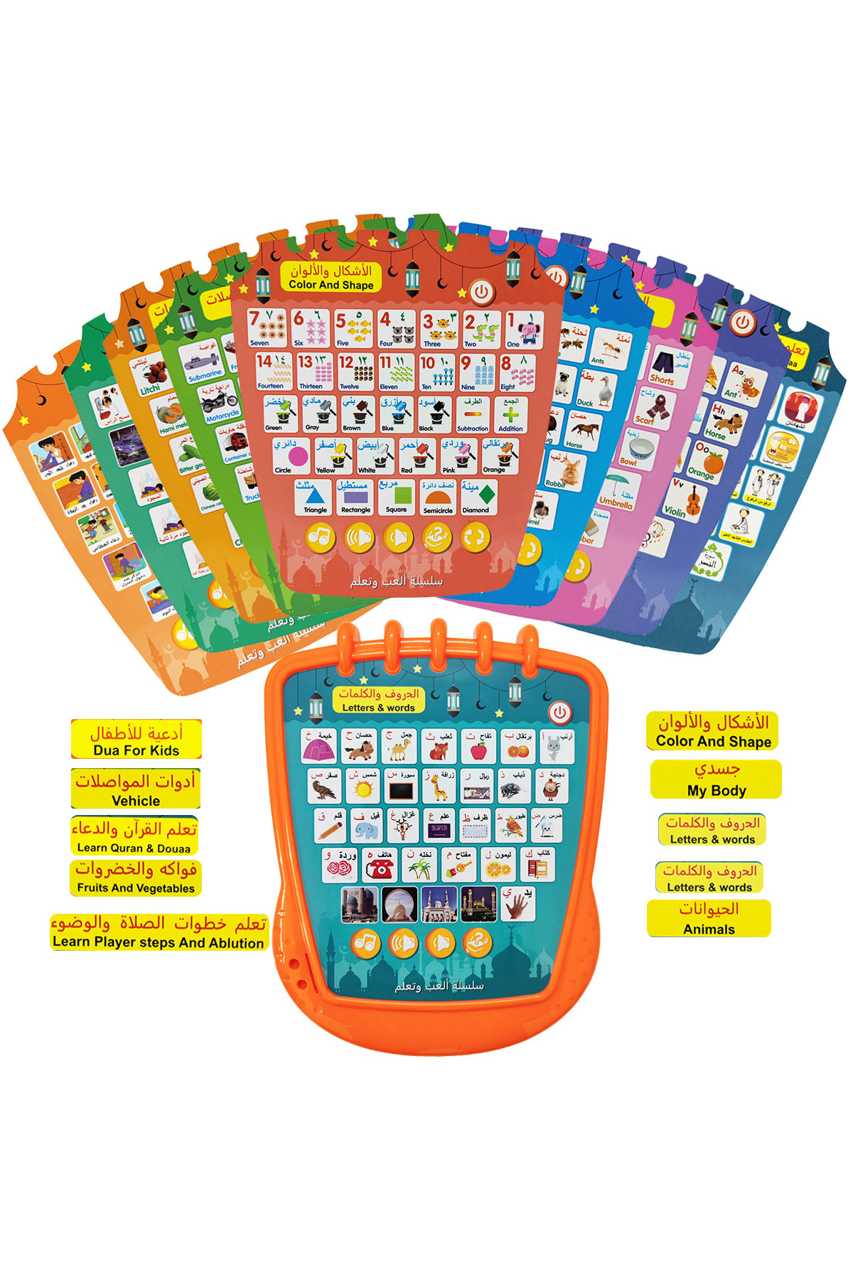 پد چندکاره یادگیری زبان انگلیسی و عربی رنگ خاکستری روشن، صداهای حروف الفبا
