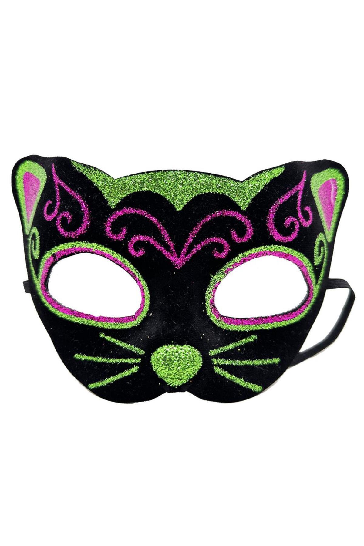 ماسک گربهی گلدوزیشده با پولکهای صورتی و سبز نسسورلد روی آستر مخمل مشکی، ۲۰×۱۳ سانتیمتر