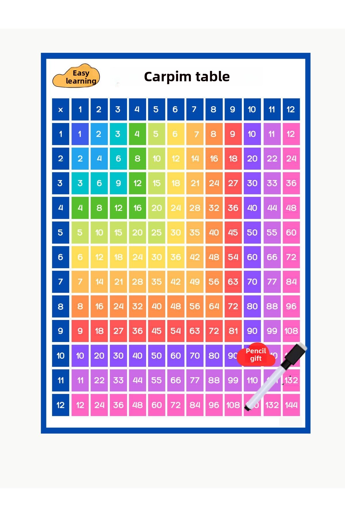 جدول اعداد فیثاغورث رنگینکمان (جدول ضرب)، قابل نوشتن و پاک کردن، روکش PVC، همراه با خودکار هدیه